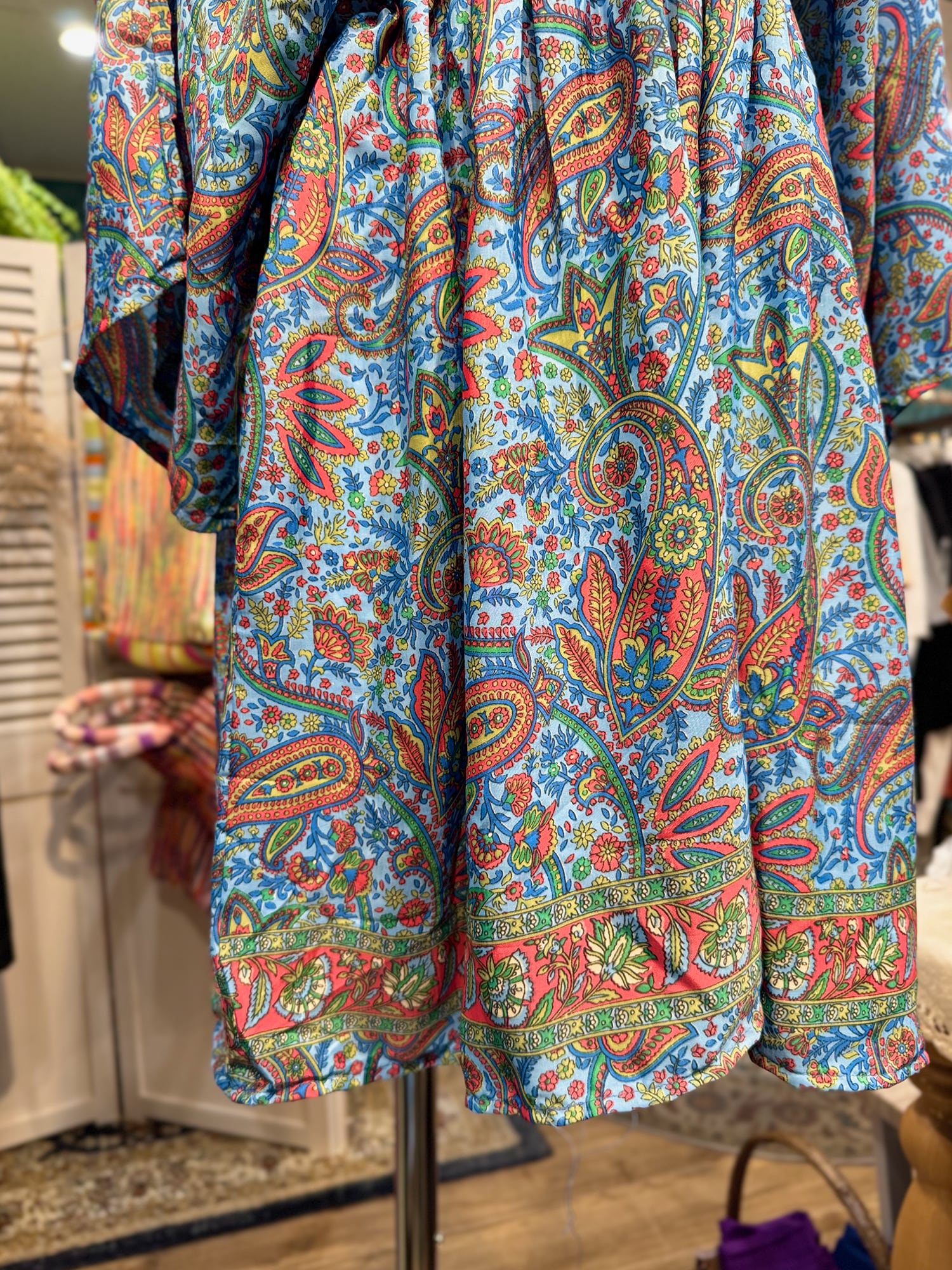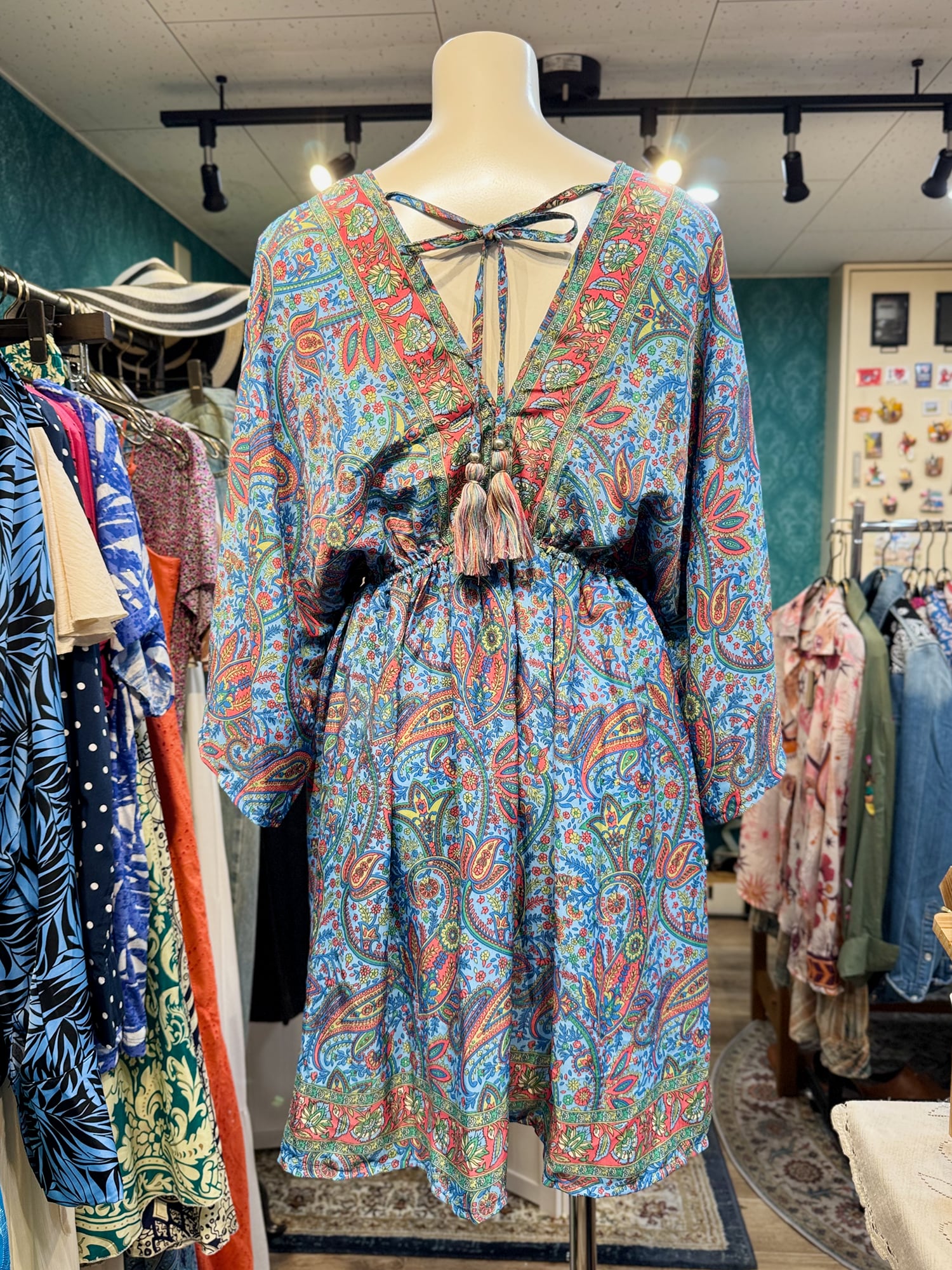 鮮やかなブルーとペイズリー柄が特徴のワンピースです♪ 背中で結くタッセルの色味もとても可愛いです!