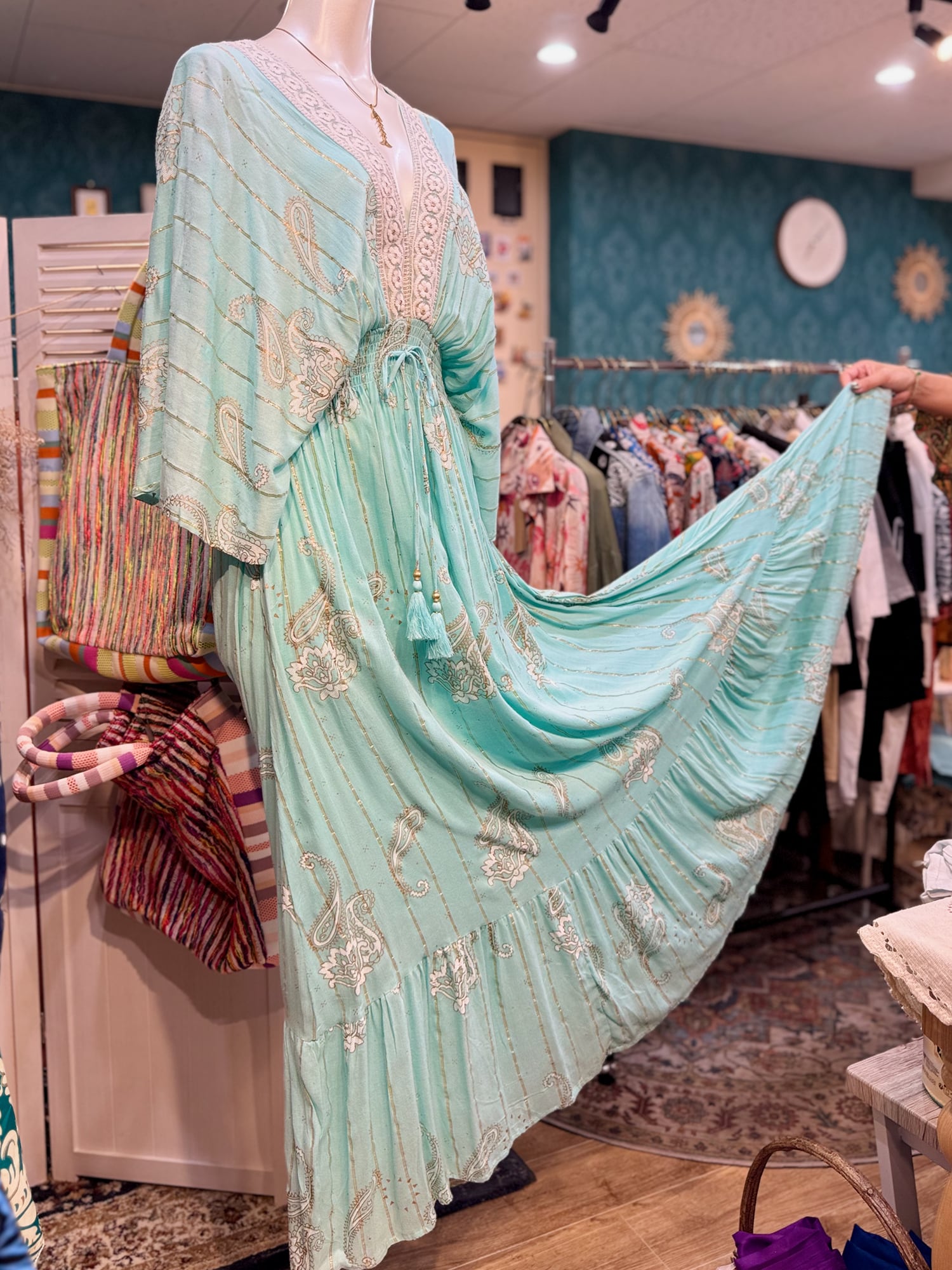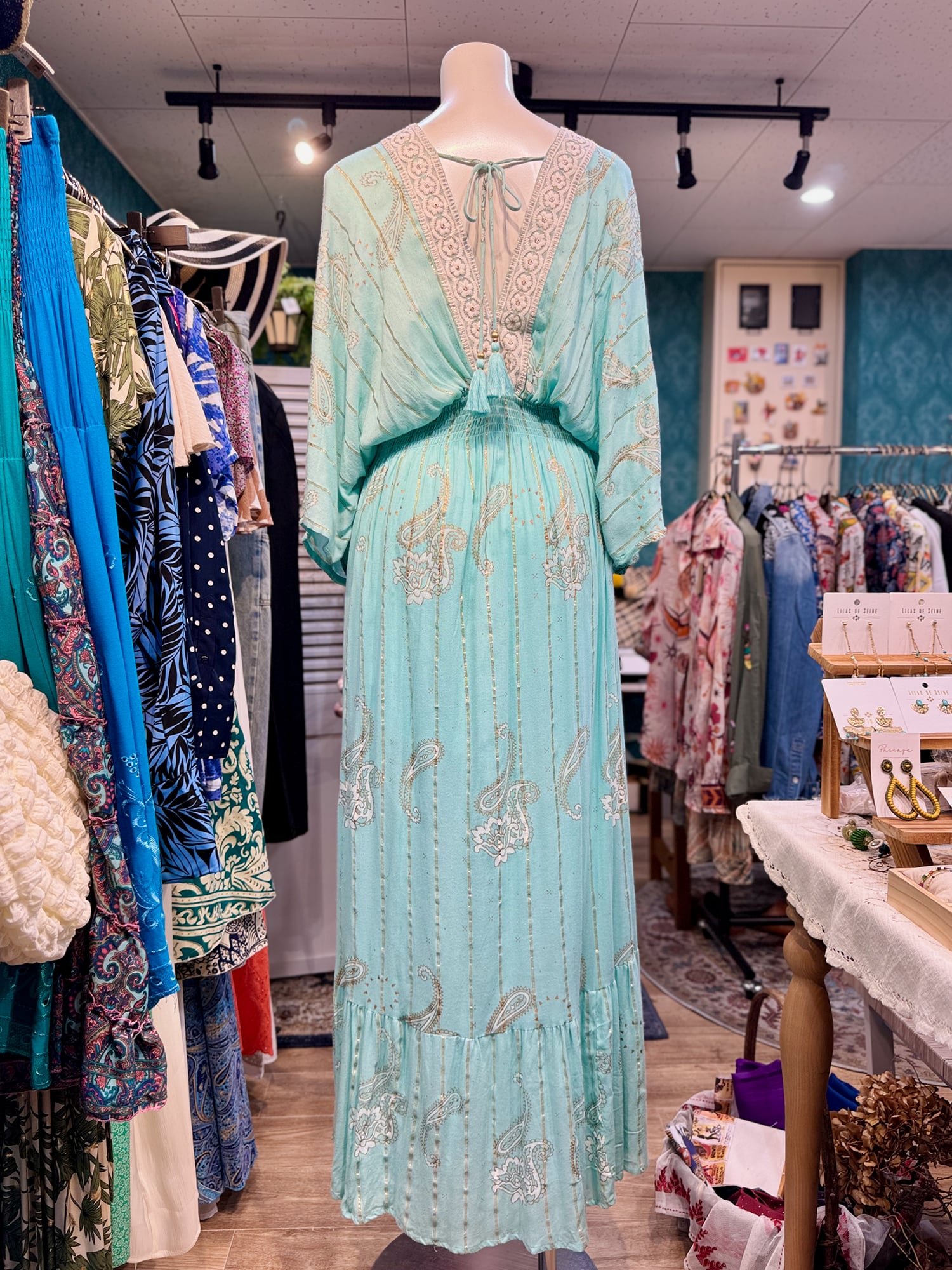 鮮やかなターコイズブルーを基調とした、ペイズリー柄と金の刺繍が特徴的なカフタン風のシルエットで、リゾートにもぴったり。