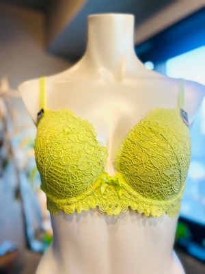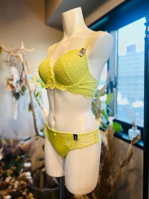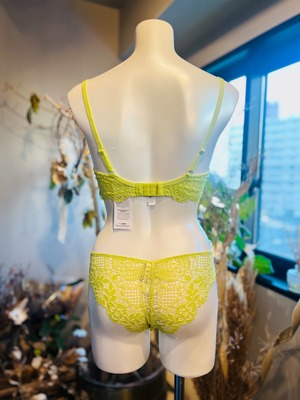 特徴的なライム色とリーフ柄が目を引く、大人女性にぴったりなビキニセットです。バスト部分にはアンダーワイヤーが入っており、しっかりとしたサポート力があります。