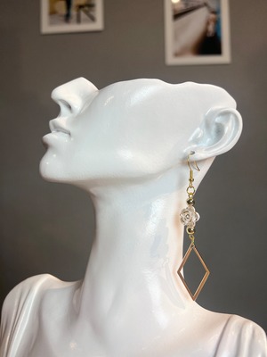 美しい花と繊細なひし形のモチーフが絶妙に組み合わさった、個性的なデザインのピアスです。華やかさとエレガントさを兼ね備えているため、パーティーや特別なイベントにピッタリのピアスです♪