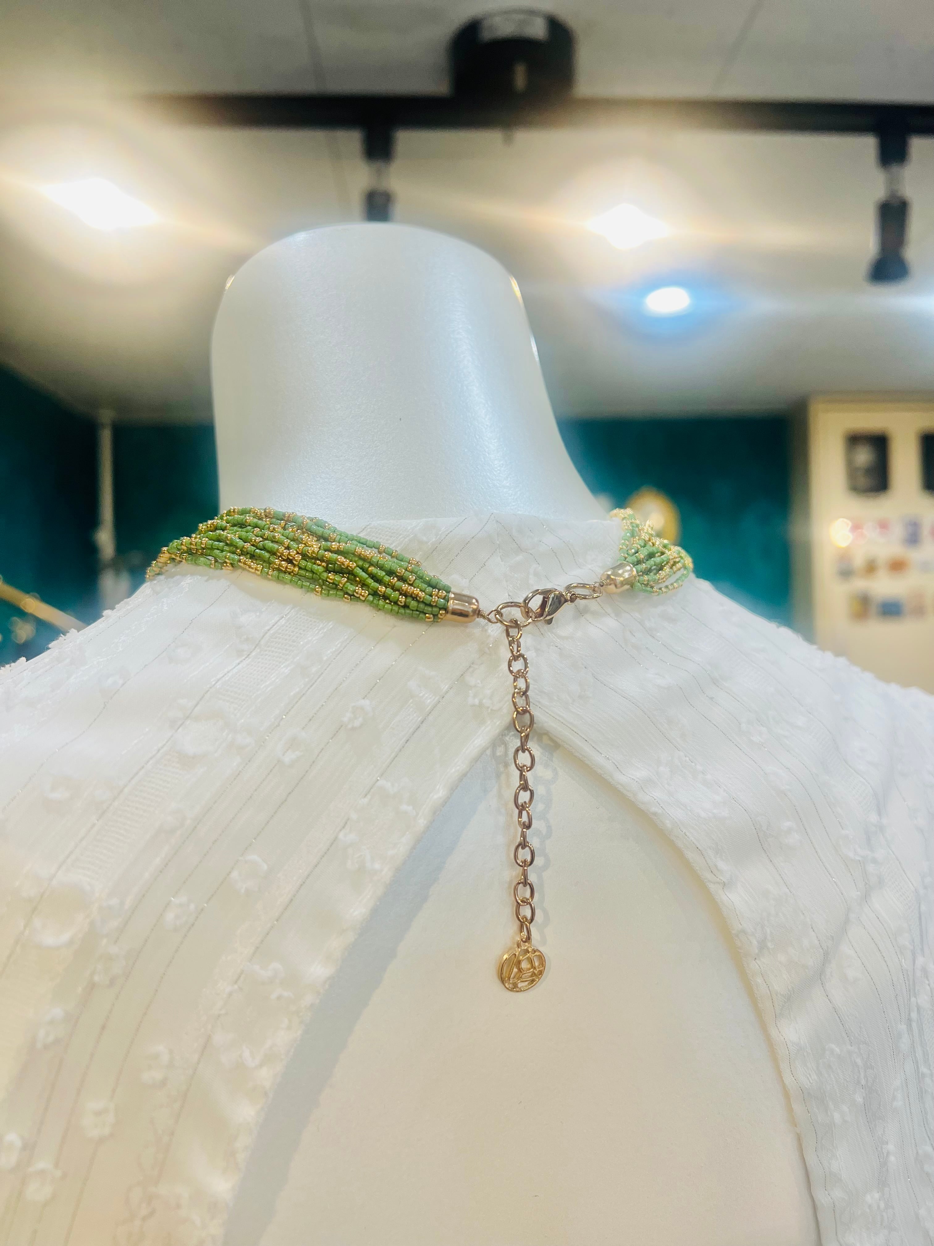 【フランス】グリーン×ゴールドビーズ12連ネックレス 華やかで心を奪う印象を与える、フランスのグリーンとゴールドビーズで作られた12連ネックレスです。