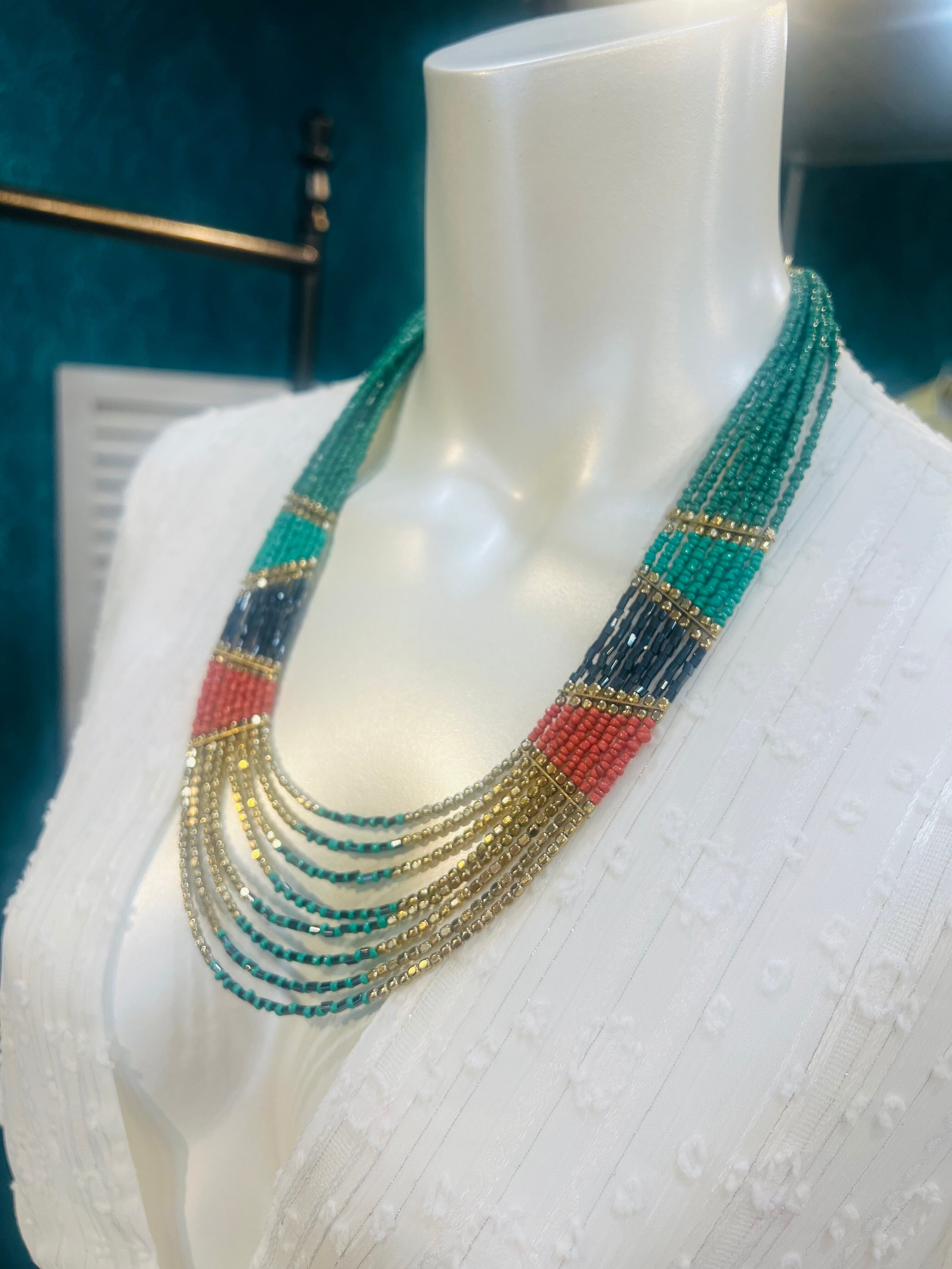 独自のデザインが魅力的な、フランス製のネイティブデザインビーズ8連ネックレスです。 色とりどりのビーズが組み合わされ、リズミカルでモダンな印象を与えます。胸元で華やかな存在感を放ち、幅広くスタイルに取り入れることができます♪